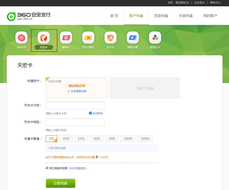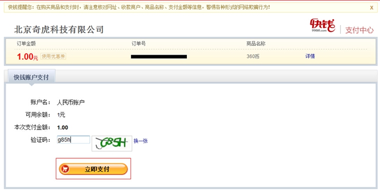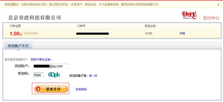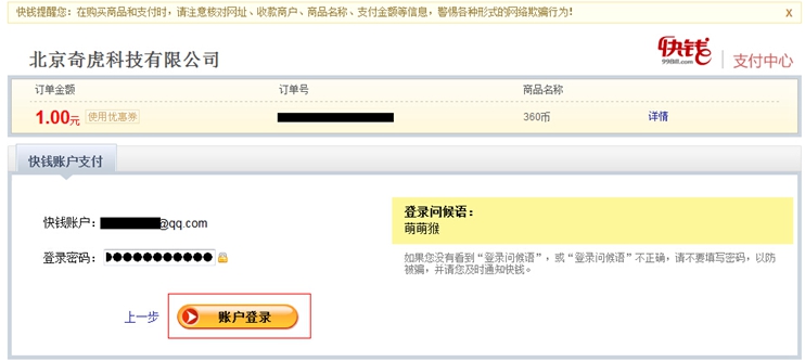 (1)点击360充值中心页面上的”账户充值“,选择”快钱“,确认”充值账号“、”充值数量“: